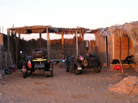 Il fait frais pourtant c´est l´autre côté de la Méditerranée. Il faut sortir rapidement de la " civilisation " et alors là ça commence à interpeller les mémés que nous sommes. Effectivement, nous sommes venues pour la piste, le sable, le sel, les nuits à la belle étoile mais aussi pour contrôler si nos pilotes et passagers sont capables de rapports simples avec l´environnement et les gens. Pour nous, pas de problème car une fois admis que le filtre à air d´une R75 n´est pas un casque allemand, la sympathie est acquise.