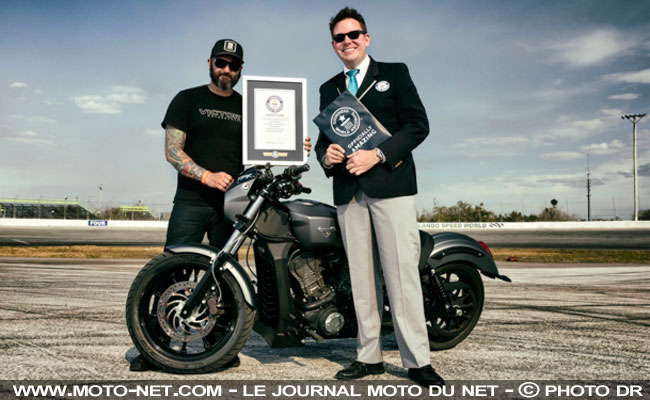 Selon Joe Dryden, le stunter maison à l'origine de ce record validé par le Guiness Book, il aurait même été possible de burner sur une plus longue distance encore si le pneu arrière n'avait pas explosé. Difficile pourtant d'en vouloir au Kenda Cruiser d'origine, au regard des mensurations du bestiau (243 kg à sec et 1565 mm d'empattement) !