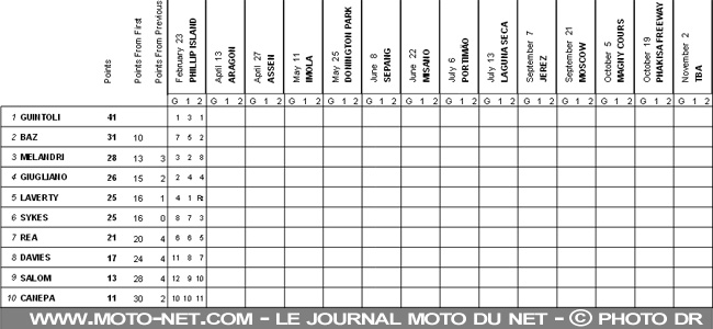 Sylvain Guintoli remporte ainsi la deuxième victoire de sa carrière et se place à la tête du classement provisoire avec 41 points, juste devant Loris Baz qui en cumule 31 ! Trop brouillon en deuxième manche, Melandri totalise 28 points et s'installe à la troisième place.