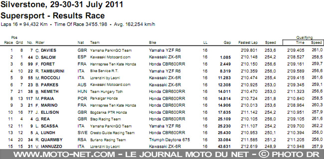 Chaz Davies remporte donc sa quatrième course de la saison, devant Davide Salom et Fabien Foret. Florian Marino termine à la 9ème place en ayant tout de même signé le troisième meilleur chrono en course, le bouillant Gino Rea finit à la 11ème place...