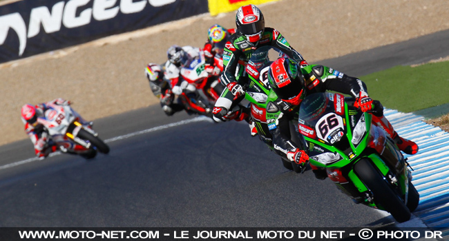 La fin de course se déroule parfaitement pour Tom Sykes. Contrairement aux courses précédentes, la Kawasaki n°66 n'a pas trop endommagé son pneu arrière et permet au Ninja anglais de gagner cette première manche WSBK à Jerez. Le pilote n°66 est rejoint sur le podium espagnol par Chaz Davies et Michael van den Mark.