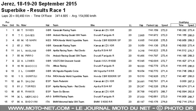 Écarté du podium pour la première fois de la saison - par Sykes, Davies et Van den Mark -, Jonathan Rea termine la première course de Jerez en quatrième position mais accomplit sa mission : remporter le titre WSBK 2015. Johnny rocks ! Première course Superbike Niccolo Canepa loupe son départ et laisse filer Sykes et Rea qui virent devant Davies. Suivent…