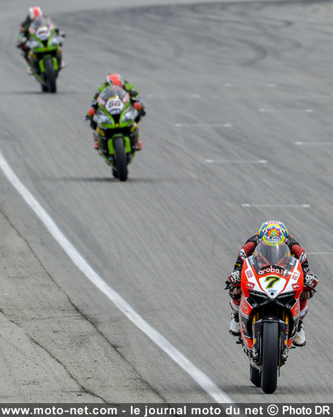 Davies profite de la baston qui oppose les deux Ninjas pour accroître son avance, qui dépasse les trois secondes au 7ème tour. Aussi à l'aise qu'en première manche, le pilote Ducati n°7 s'envole vers le doublé : son premier de la saison... et le tout premier de la 1199 Panigale !