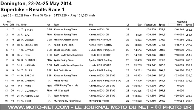 Si la septième place de Guintoli peut paraitre décevante - et due à un mauvais choix de pneu ? -, les 12 et 13ème places de Fabien Foret et Jérémy Guarnoni sur leurs ZX-10R Evo sont plus satisfaisantes. Quant à Romain Lanusse, il peut être fier de sa 16ème place décrochée à l'occasion de sa toute première course en WSBK !