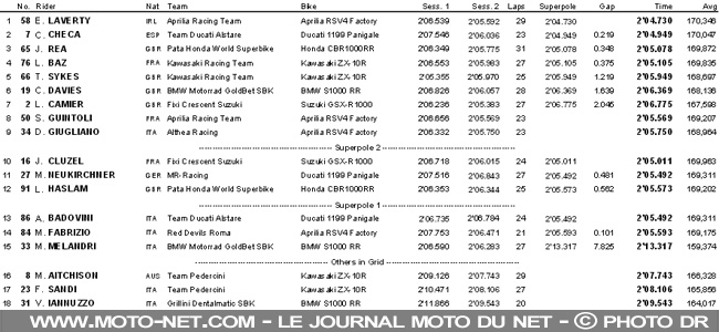 Au final, Eugene Laverty sort heureux vainqueur de cette baston mémorable. Il s'agit pour le pilote officiel Aprilia de sa toute première Superpole en World Superbike. L'Irlandais a pourtant déjà disputé 68 courses (soit 34 week-end), gravi 20 podiums et remporté 7 victoires dans cette même catégorie...