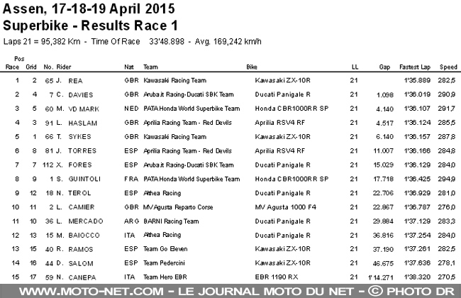 Jonathan Rea a parfaitement géré cette première course Superbike à Assen, attendant les tous derniers tours pour assommer Chaz Davies. Mais la vedette aux Pays-Bas ce matin est Michael van den Mark, premier pilote néerlandais à monter sur un podium WSBK. Il interrompt aussi la série de podiums 100% britannique en 2015. Première course Superbike…