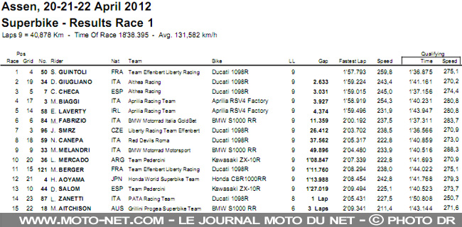 Brett McCormick part à la faute : contrairement à son ancienne discipline (il était inscrit en Superstock 1000 en début d'année) le Canadien aura une seconde chance cet après-midi... Son coéquipier Sylvain Guintoli circule en 9ème position juste derrière Fabrizio, Maxime Berger, troisième homme du team Ducati n'est pas - encore ? - dans les points.