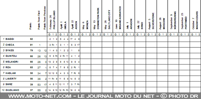 Malgré un week-end extrêmement difficile, Max Biaggi s'empare à Assen de la tête du classement provisoire et devance Carlos Checa d'un petit point (92 contre 91). Tom Sykes (79) conserve sa troisième place. Les trois hommes cèdent toutefois beaucoup de terrain à leurs poursuivants... Vivement le 6 mai prochain !