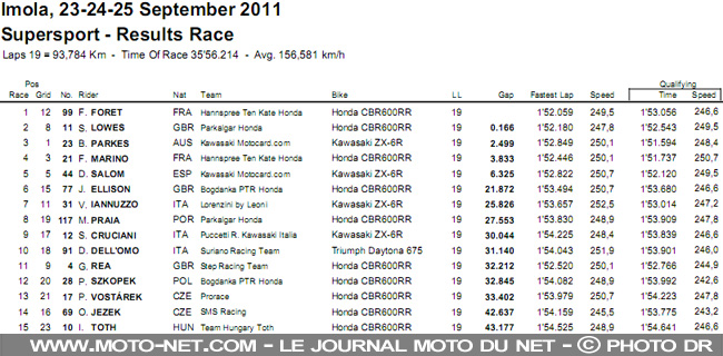 Le dernier tour voit Rea perdre l'avant en pleine courbe et Parkes monter sur la troisième marche du podium, loin devant Florian Marino. Aux avant-postes, Fabien ne sort pas sa tête de la bulle - ne se retourne pas , contrairement à sa mauvais habitude ! - et remporte sa première course de la saison, la 13ème de sa carrière en Mondial Supersport !