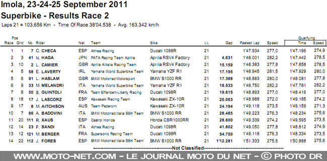 Checa signe sa 12ème victoire de la saison avec un superbe wheeling sur la ligne d'arrivée. La Ducati n°7 est suivie sur le podium par les Aprilia n°41 et n°2 tandis que la Yamaha n°33 passe sous le drapeau noir et blanc après la Yam' n°58 et la BMW n°91. La Honda n°4, promise à une belle victoire, ne termine pas cette manche.