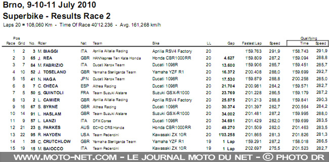 Dimanche 11 juillet 2010 - Max Biaggi (Aprilia Alitalia) a remporté la seconde manche Superbike cet après-midi à Brno, après avoir terminé deuxième lors de la première course. L'Empereur romain signe ainsi sa neuvième victoire de la saison et sa dixième à Brno. Il devance de 4,6 secondes Jonathan Rea (Hannspree Ten Kate Honda), vainqueur en première manche, tandis que Michel Fabrizio (Ducati Xerox) termine troisième devant James Toseland (Yamaha Sterilgarda) quatrième.