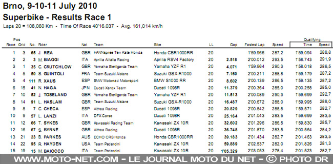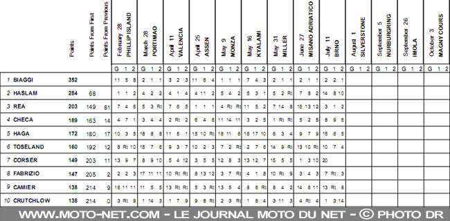 Au championnat, Biaggi accroît encore sa très confortable avance avec 352 points devant Leon Haslam (Suzuki Alstare) 284 et Jonathan Rea 203.