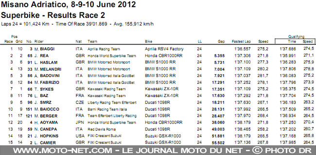 Quatre heures plus tard, Max Biaggi était de retour sur la plus haute marche, suivi cette fois par Jonathan Rea et Leon Haslam. Les deux pilotes Ducati Althea partis à la faute, une horde de BMW complète le Top 6. Un autre rookie se fait remarquer en seconde manche : Loris Baz !