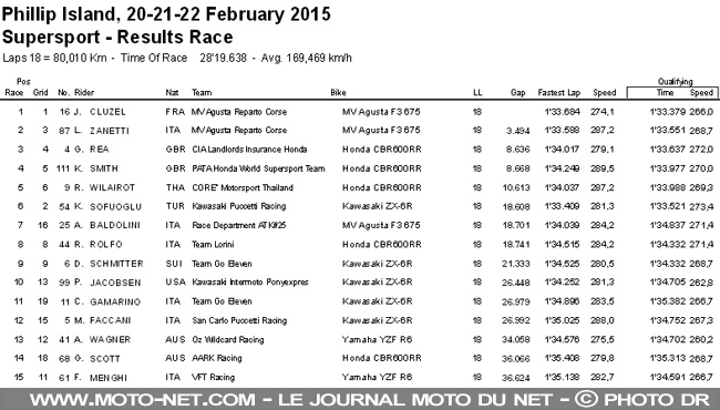 Bien décidé à coiffer la couronne mondiale du Supersport cette année après avoir terminé deuxième pour la seconde fois de sa carrière l'an dernier, Jules Cluzel (MV Agusta Reparto Corse) a réalisé un week-end parfait à Phillip Island pour l'ouverture de la saison 2015 : pole position et victoire !