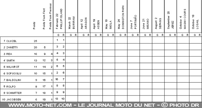 Le triple champion Kenan Sofuoglu, victime d'un tout droit dans le sixième tour, n'a rejoint la piste qu'en vingtième position et limite la casse en remontant à la sixième place devant Alex Baldolini (Race Department ATK#25), Roberto Rolfo (Team Lorini), Dominic Schmitter (Team Go Eleven Kawasaki) et Patrick Jacobsen (Kawasaki Intermoto Ponyexpres).