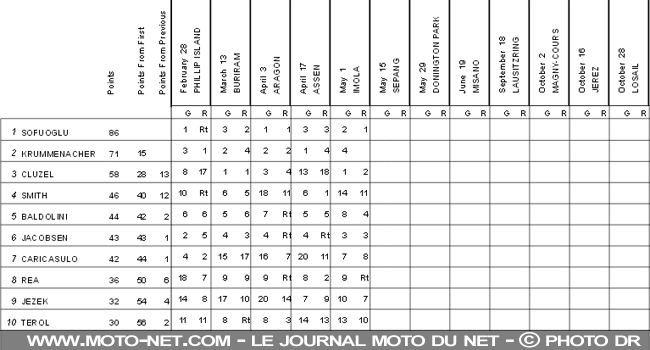 Sofuoglu profite de l'abandon de son jeune coéquipier pour remporter sa deuxième victoire de la saison et prendre la tête du classement provisoire : 86 points contre 71 toujours pour Krummenacher. Notre cher Cluzel empoche 20 points et accède à la 3ème place du général (58 points).