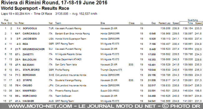 Le leader du championnat Supersport 2016 accroit généreusement son avance sur son coéquipier : Sofuoglu cumule 146 points, contre 106 pour Krummenacher cinquième de cette course à Misano. Jacobsen remonte sur le suisse (92 points au total) mais pas sur le turc.