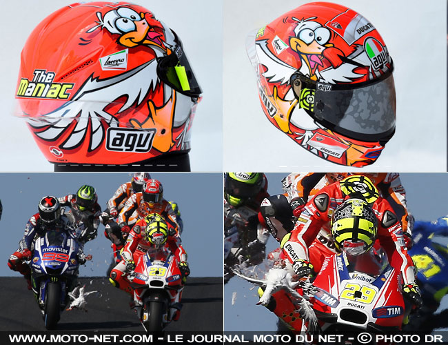 La partie supérieure droite de son AGV Pista - rouge Ducati, of course ! - représente la caricature d'une mouette visiblement chamboulée... Sur les côtés de sa visière et à l'arrière du casque figurent le surnom de l'officiel de Bologne ("The Maniac”, car l'italien apprécierait l'ordre !) ainsi que la cible qu'il affiche sur ses équipements, notamment sur le dessus de la poche à eau de sa combinaison Dainese.